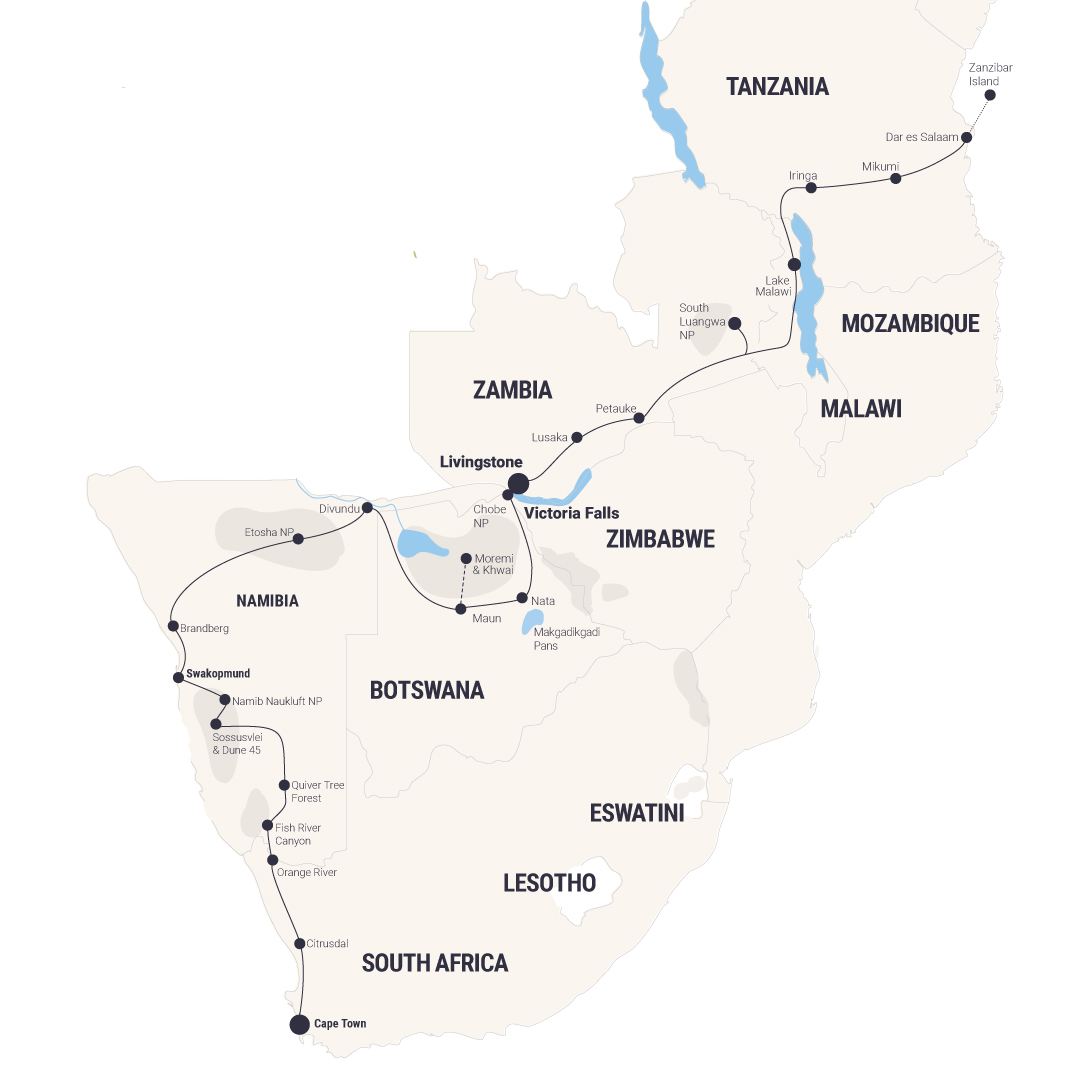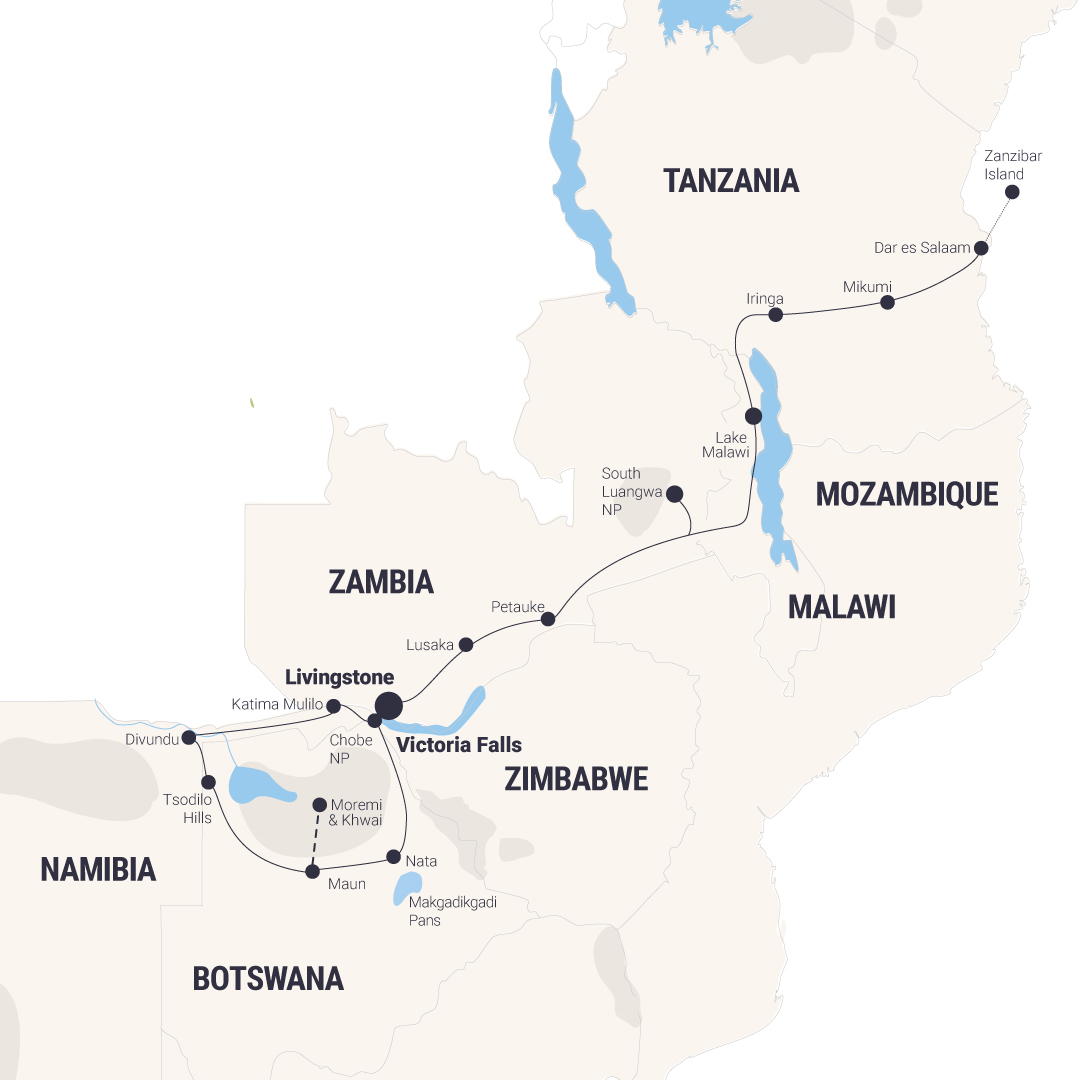 Tanzania, Malawi, Zambia, Zimbabwe, Botswana, Namibia, South Africa