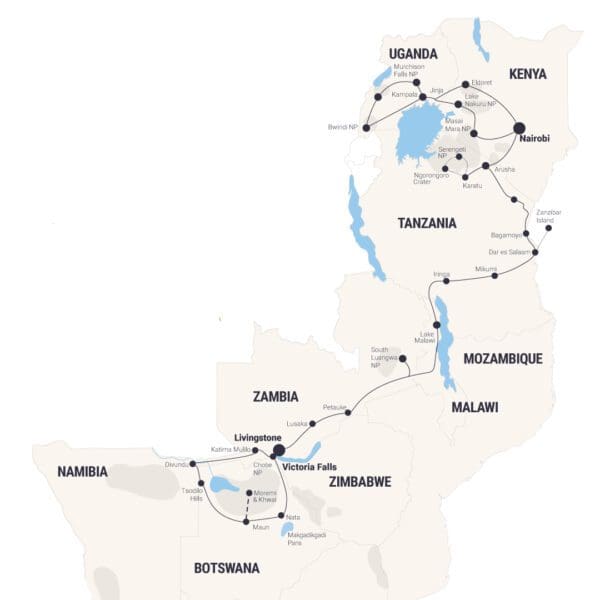 Combine the vivid Kavango Zambezi Conservation Area with East Africa’s many marvels, a route starting with Victoria Falls’ vista and Botswana, travelling all the way south, through Tanzania and Kenya, to Uganda for an extraordinary encounter with critically endangered Gorillas.