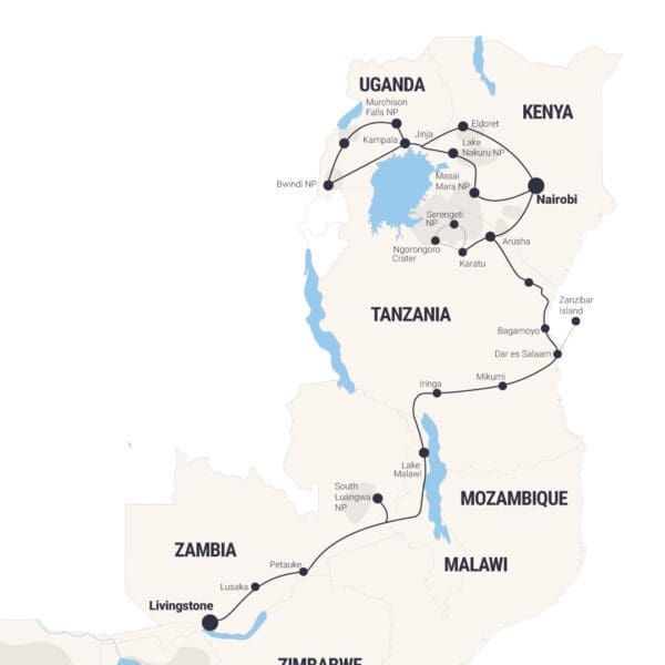 We end in Livingstone, where Victoria Falls thunders with primal majesty, a grand finale to an odyssey stitching together seven African countries into a tapestry of unforgettable memories. We recommend spending an extra night in Livingstone to be able to revel in all the thrilling activities around the falls if you so choose.