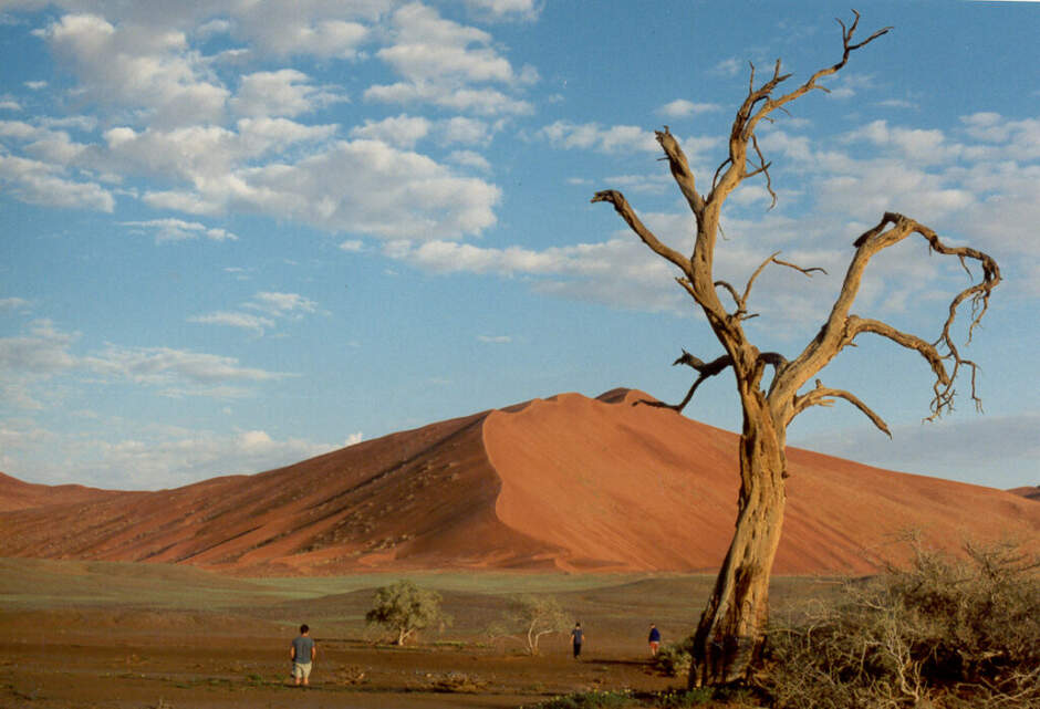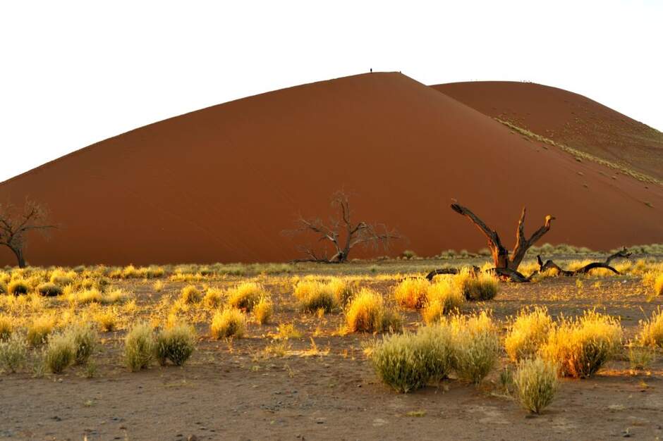 Elim Dune, set near the Sesriem gate and standing at 100 meters, is more secluded. Its name traces back to a farm once located here. Easily accessible, it’s perfect for peaceful walks, with stunning sunsets and views of the Namib-Naukluft mountains and the Tsauchab River below.