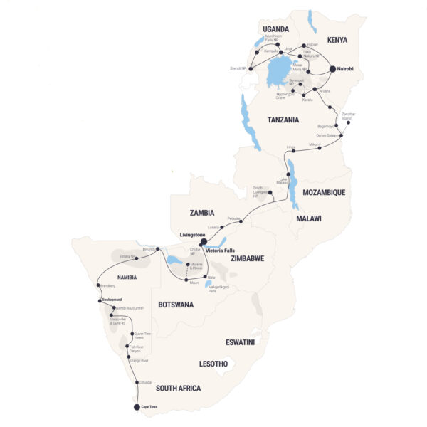 Included – Meals as outlined in the itinerary, which are prepared and served at the Nomad truck – Breakfast 56, Lunch 50, Dinner 46 / accommodation / qualified crew / filtered water / transport in the Nomad truck / included highlights as per the itinerary / entrance fees to National Parks.