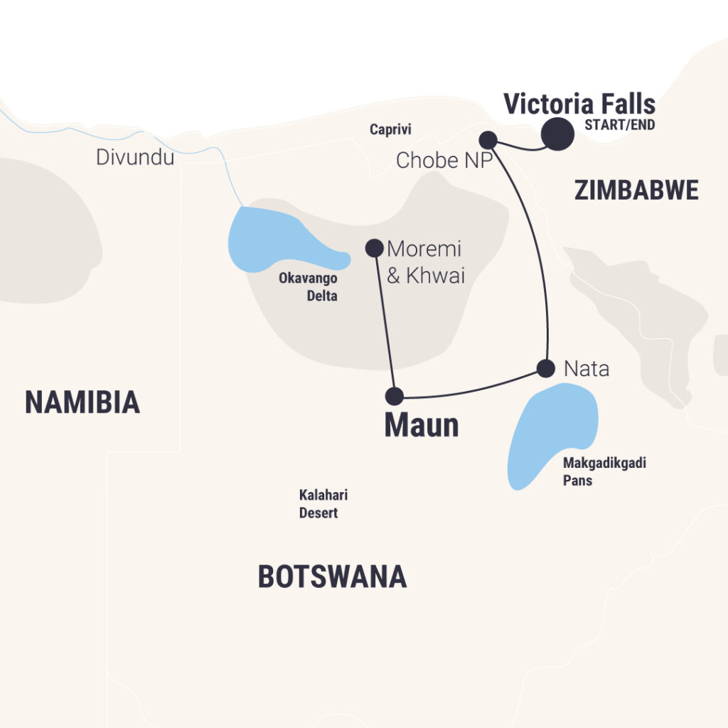Shifting our landscape, we travel to the arid edge of the Makgadikgadi salt pans till we reach Nata. Begin the day on foot, coming face-to-face with animals on a guided optional morning bush walk. That afternoon, the Chobe River draws us to a highlight on tour as you board a boat and cruise along its channel. Scout for elephant herds playing in the water and hippos sunning on the Chobe’s banks, views you will cherish for all time.