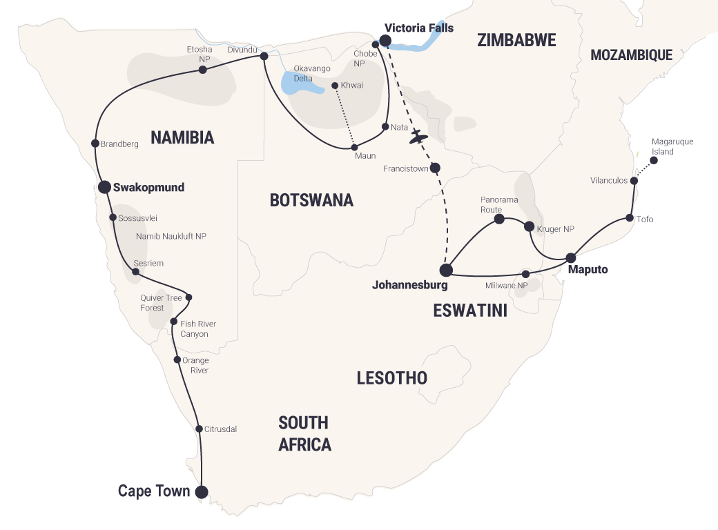 A true mosaic of Southern Africa, filled with vistas and wildlife. Be whisked away into the dunes of Namibia’s desert and skim the waterways of Botswana before exploring the Kruger National Park’s bushveld and finishing at Mozambique’s alluring coastline.