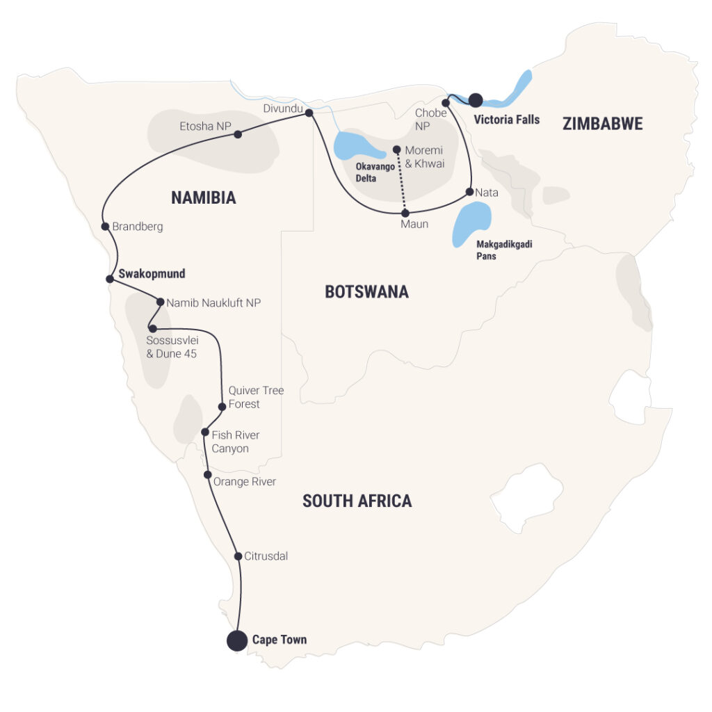 With an itinerary filled with bucket-list views, our best seller starts in Cape Town and provides stunning contrasts from Namibia’s otherworldly views to Botswana’s vibrant wildlife and the awe-stunning Victoria Falls. This journey weaves together breathtaking landscapes and unforgettable moments for a truly diverse travel experience.