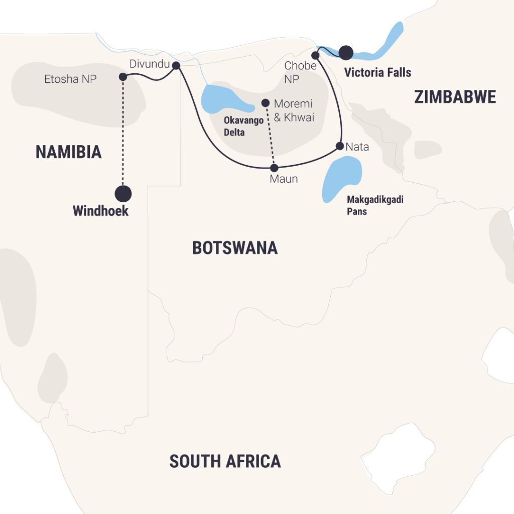 We leave the white sands of Etosha behind and journey toward the Kavango River, entering the Kavango-Zambezi Transfrontier Conservation Area. Spanning five countries, including parts of our route through Botswana and Zimbabwe, one of the world's largest protected areas, supporting diverse wildlife and ecosystems. Our overnight stop in Divundu offers a glimpse into this rich natural haven.