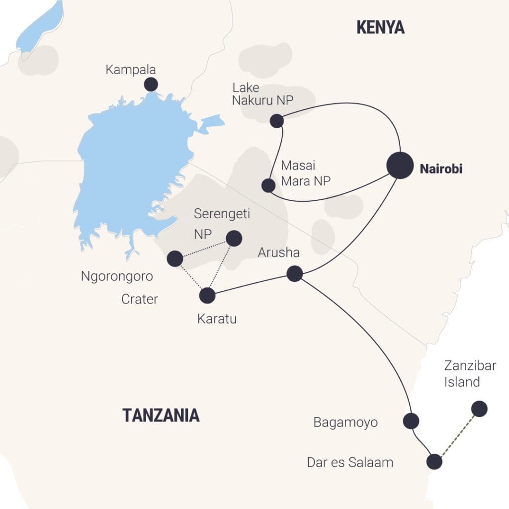 Explore Kenya and Tanzania’s extraordinary national parks and natural wonders, starting in Zanzibar’s tropical landscape. Be prepared to unwind and immerse yourself in gorgeous wildlife and vistas of East Africa on this route.