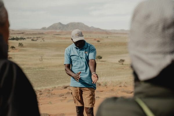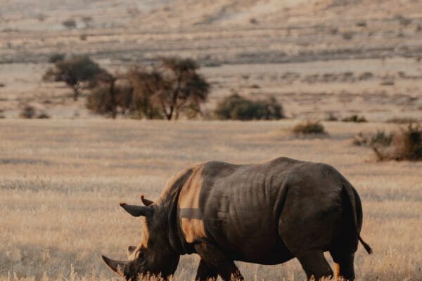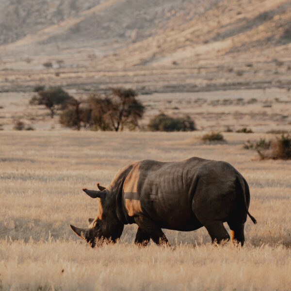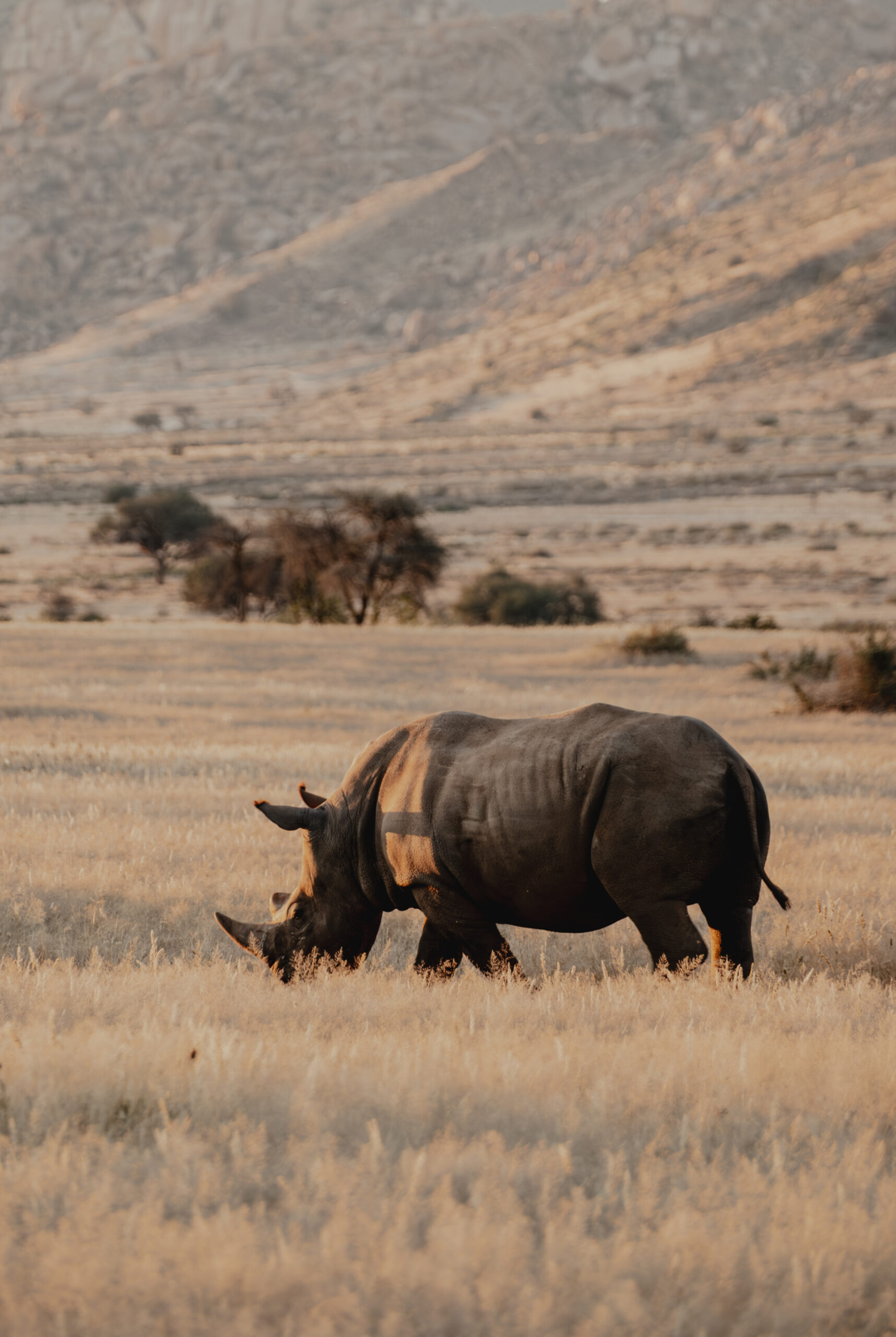 Morning guided hike onto the plateau for sweeping views, flora, fauna, and Herero cultural insights. Afternoon rhino drive in the savannah below, with chances to spot giraffe, kudu, and rhino. Breakfast and dinner included.