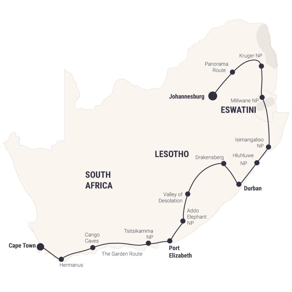 Plunge into the full South African experience, including detours into Lesotho and Eswatini, brimming with breath-taking natural beauty. From the world-famous Kruger National Park to coastlines with endangered penguins, be encompassed in vibrant history, wildlife and culture.